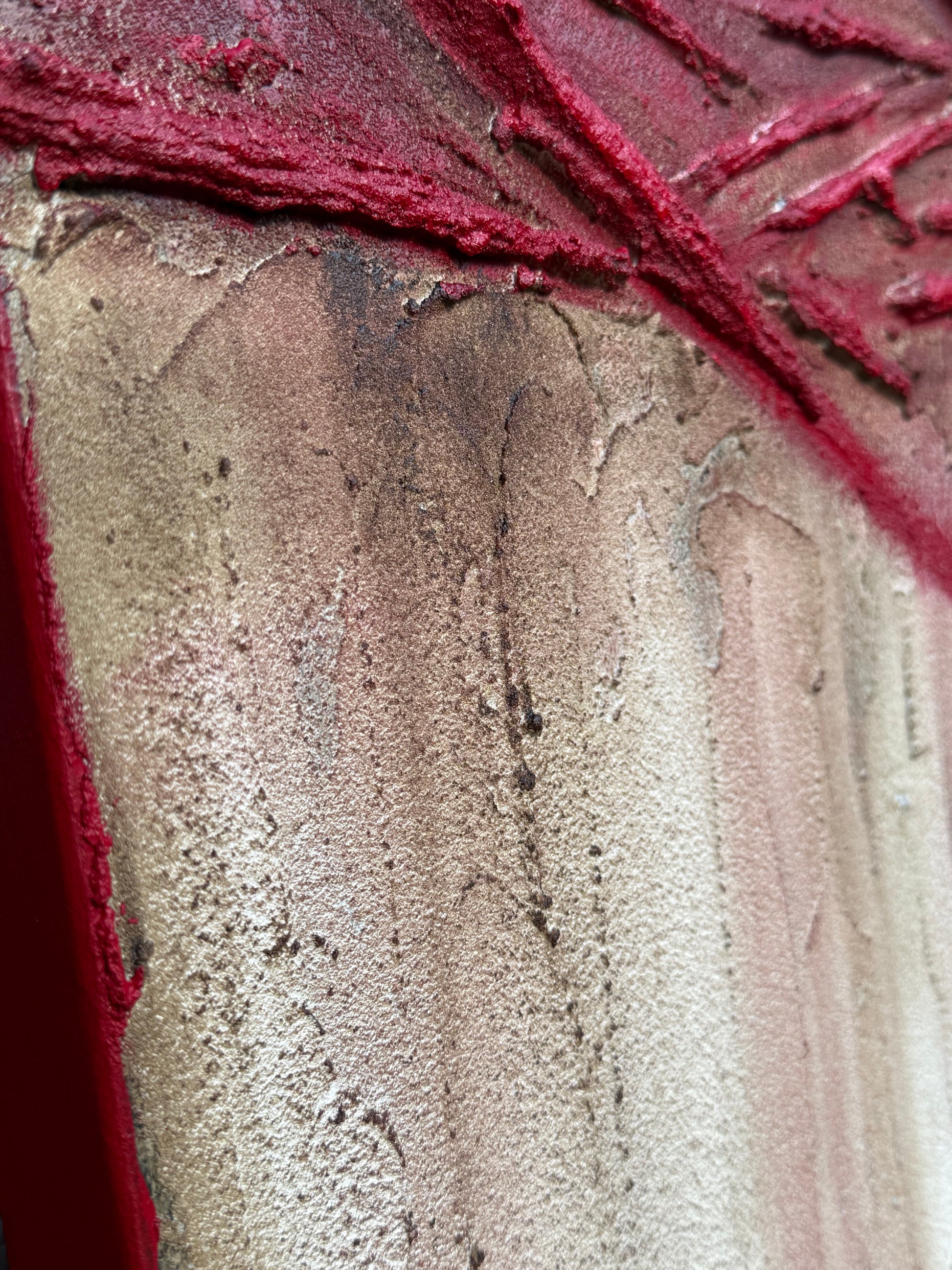 « UMBRAL » est une œuvre abstraite audacieuse, marquée par une texture organique et centralisée par des traits diagonaux et horizontaux rouge intense qui évoque une faille ou une fracture. Cette composition puissante mêle tension et équilibre, matière brute et émotion, aidé par les pigments des couleurs.